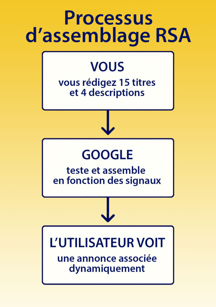 Considérez les RSA comme des tests multivariés à grande échelle. Au lieu d’exécuter des campagnes A/B isolées, vous donnez à Google un ensemble d’ingrédients, et il teste des combinaisons sur des milliers de recherches.