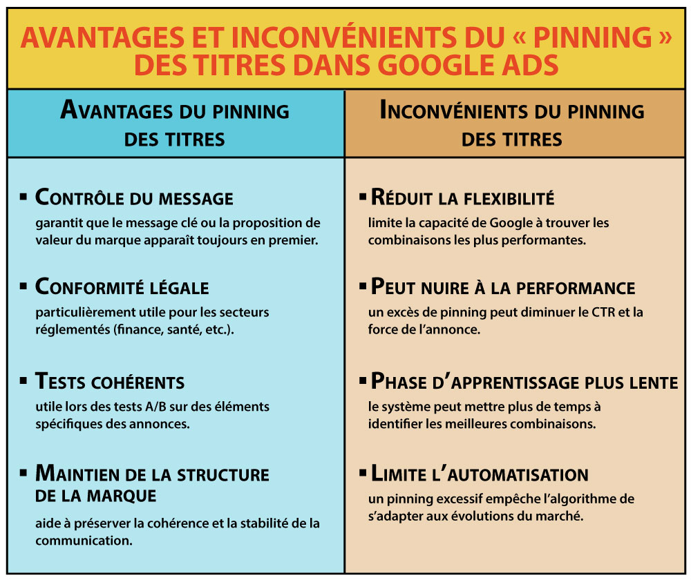 - Peut nuire aux performances : Un épinglage excessif peut diminuer le CTR et la force de l’annonce