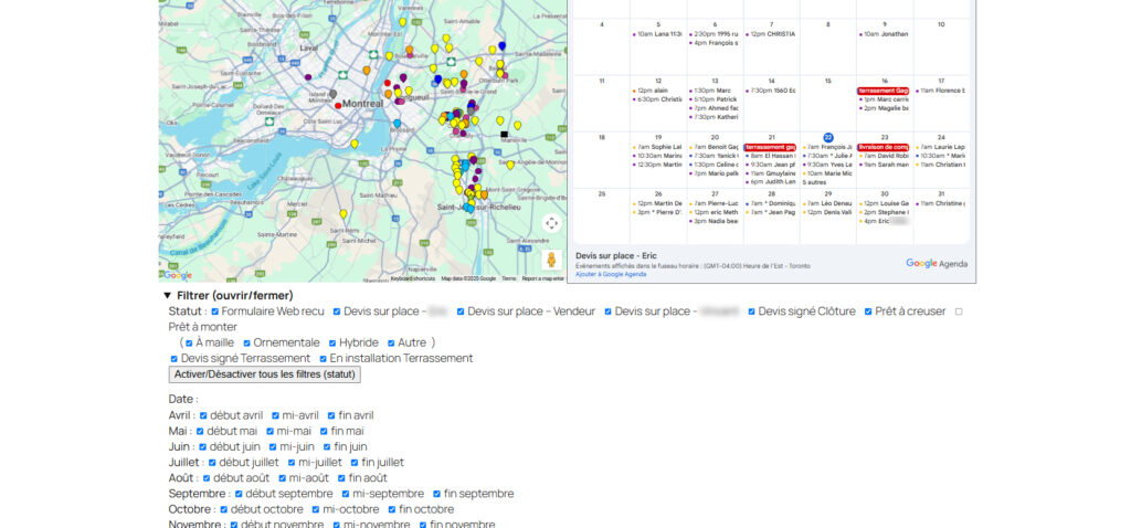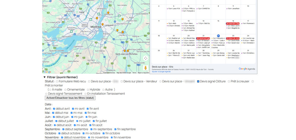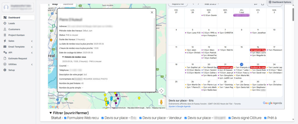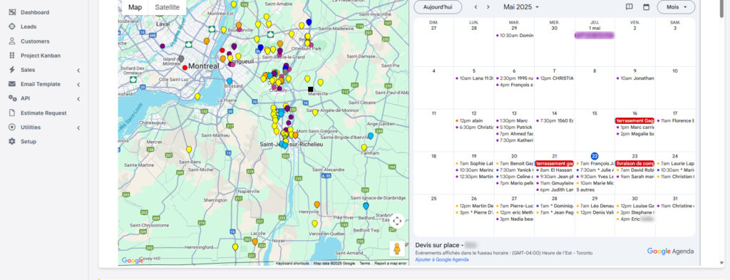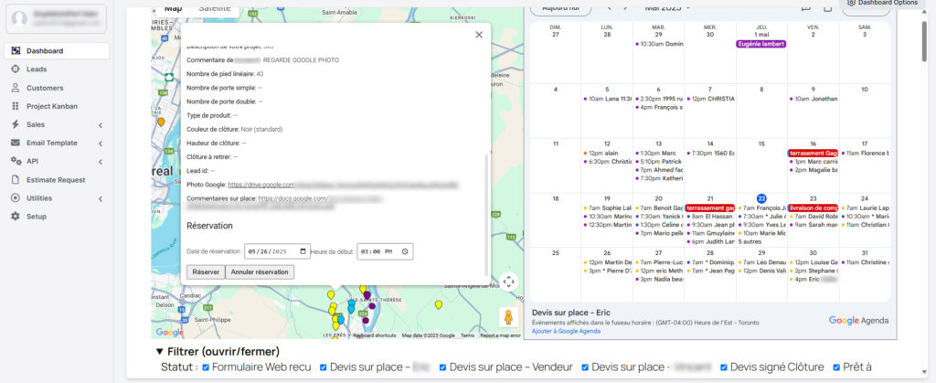 CRM personnalisé pour les entreprises de services avec intégration de Google Maps et Agenda