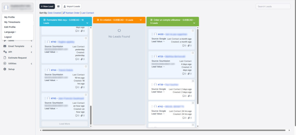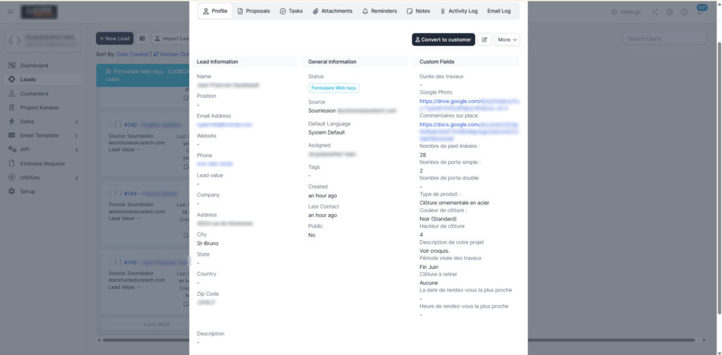 Nous avons développé une version entièrement personnalisée de Perfex CRM pour un client opérant dans le secteur des services. L'entreprise gère des dizaines de projets simultanés sur le terrain (construction, rénovation, nettoyage) et avait besoin d'un système pour gérer les prospects, coordonner les visites de sites, suivre les étapes du projet et automatiser les flux de travail internes — le tout dans une seule interface.