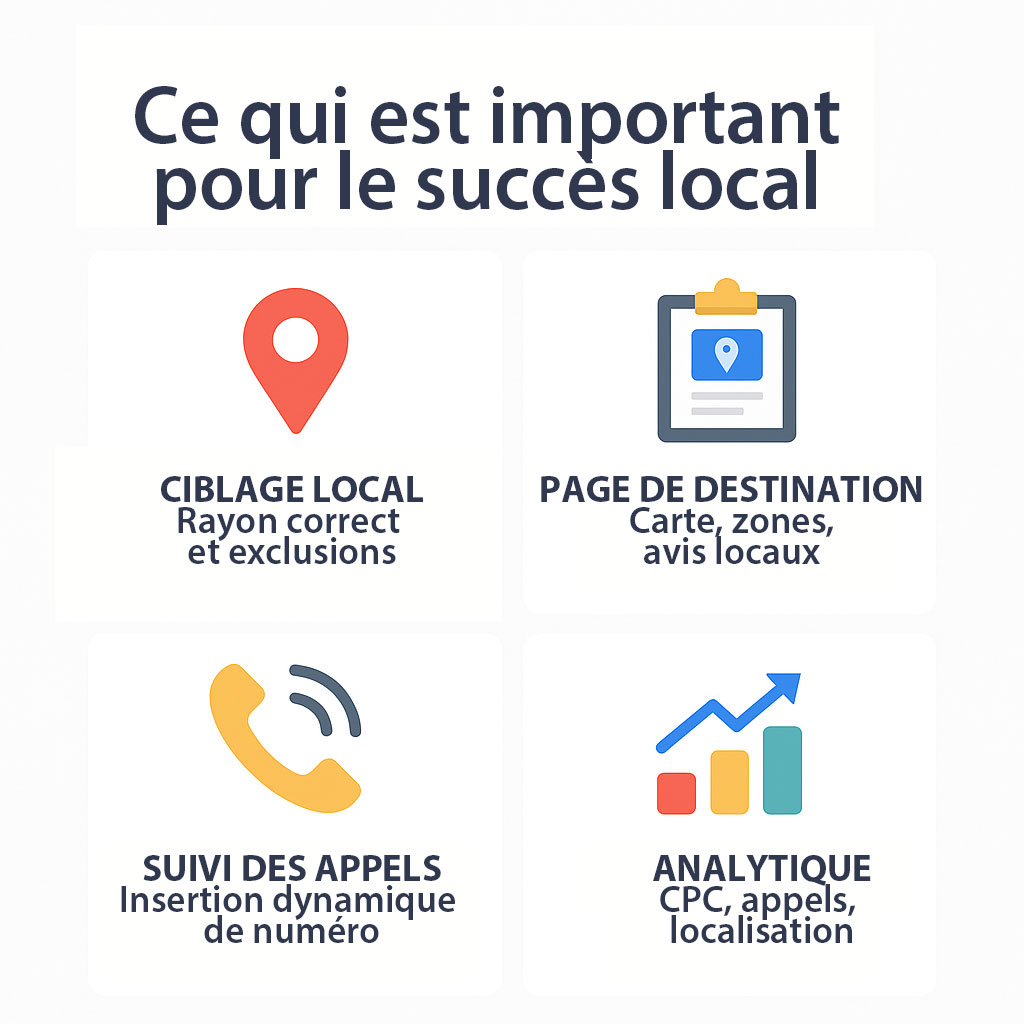 Figure : Facteurs clés de succès pour une campagne Google Ads locale performante — ciblage, pages d’atterrissage, suivi des appels et analyses.