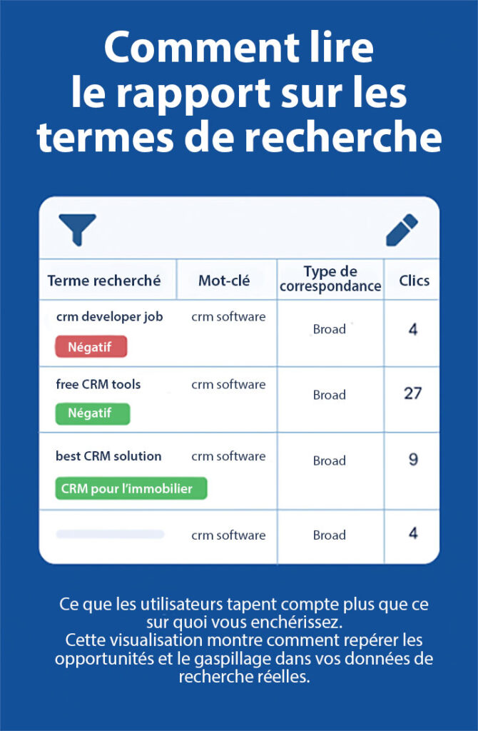 Utilisez le rapport sur les termes de recherche pour découvrir ce que les utilisateurs recherchent réellement. Mettez en évidence et excluez le trafic non pertinent (« outils gratuits », « emplois ») et redoublez d’efforts sur les requêtes à forte intention (« CRM pour l’immobilier ») qui génèrent de vrais résultats.