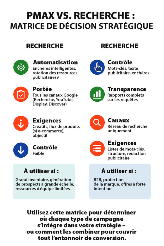Les campagnes de recherche restent inégalées en termes de transparence et de contrôle. PMax offre une évolutivité et une automatisation dans tout l’écosystème Google. Les meilleures stratégies combinent les deux — s’ancrant sur l’intention, évoluant avec l’automatisation.