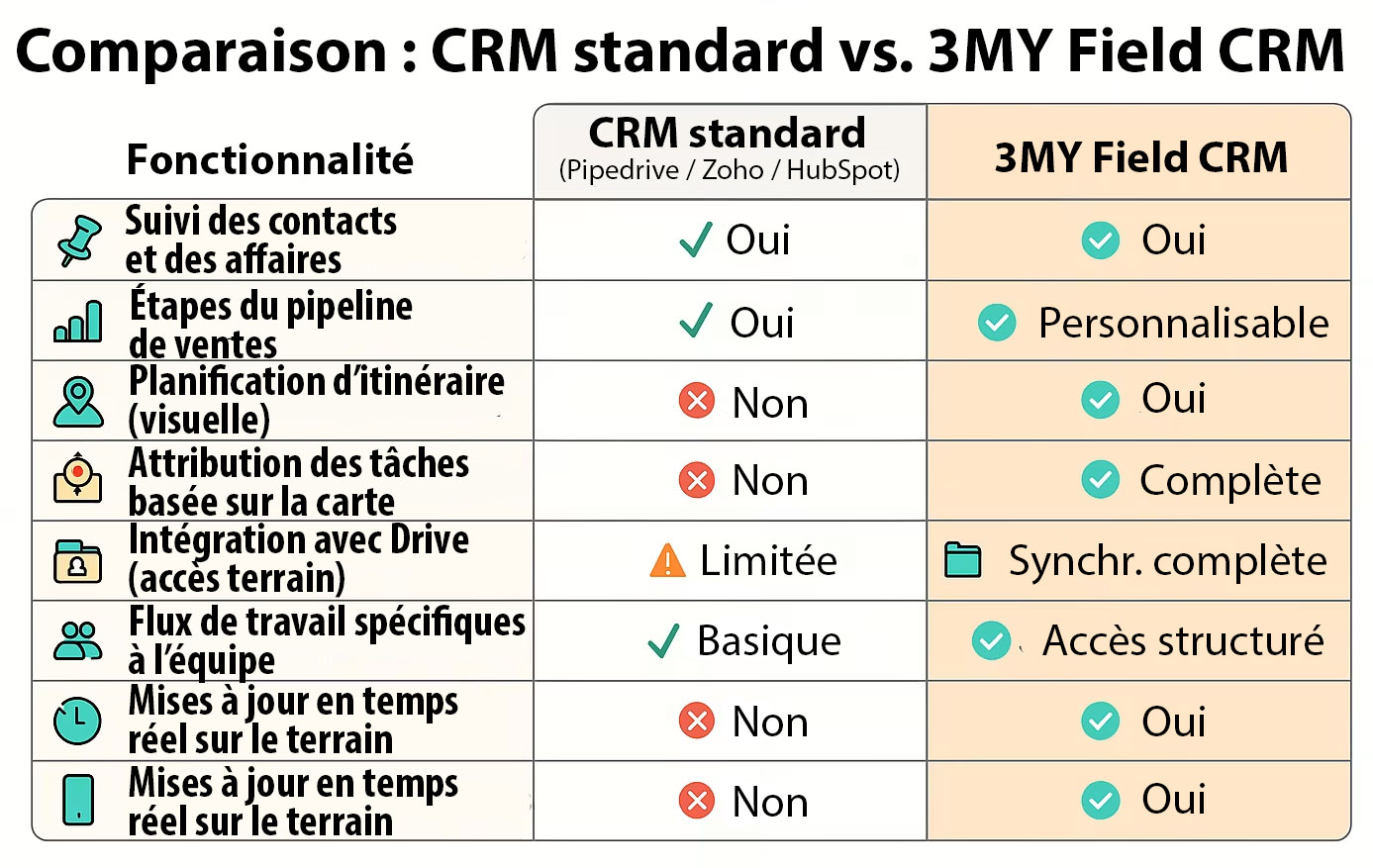 Les CRM standard sont construits autour des pipelines de vente, et non des flux de travail physiques. C’est parfait pour les cycles de transaction SaaS ou B2B, mais pour les opérations mobiles, ils se cassent rapidement.