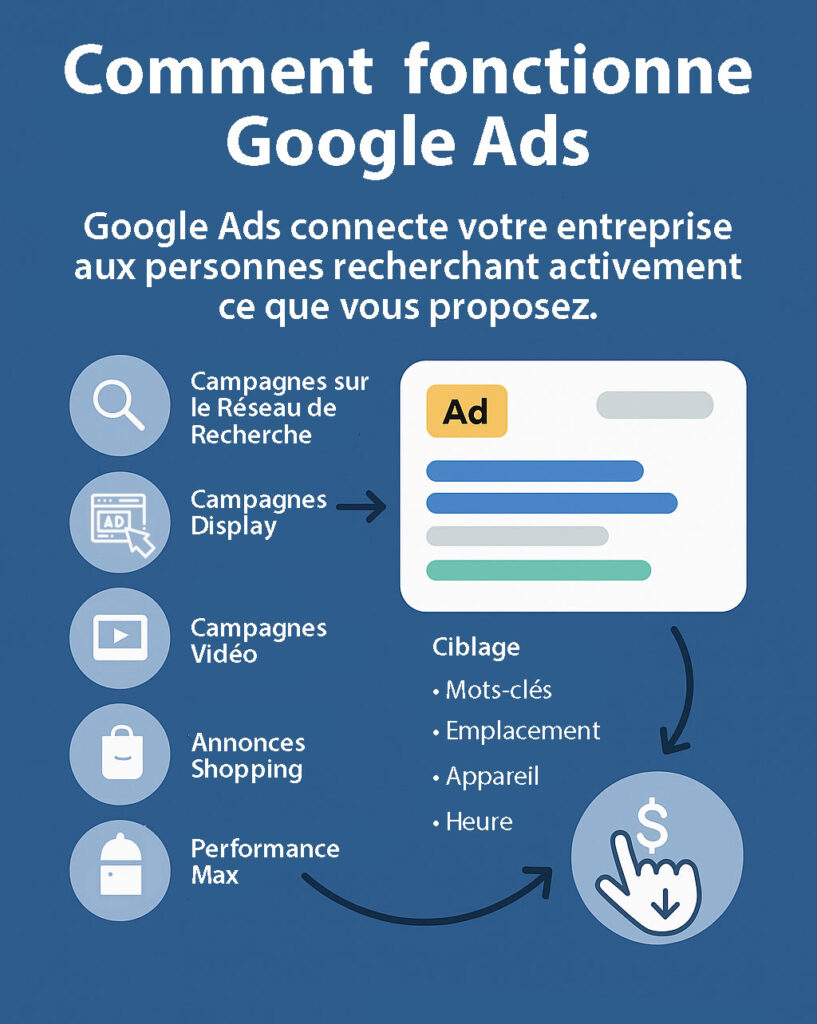 Google Ads est la plateforme de publicité en ligne de Google qui permet aux entreprises d’apparaître devant les utilisateurs qui recherchent activement des produits, des services ou des informations. Ces annonces peuvent apparaître dans les résultats de recherche, sur YouTube, dans Gmail, sur Google Maps et sur des millions de sites web partenaires du Réseau Display de Google.