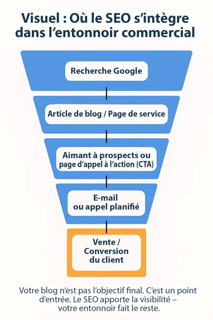 Votre blog n’est pas le but ultime. C’est un point d’entrée. Le SEO apporte de la visibilité — votre entonnoir fait le reste.
