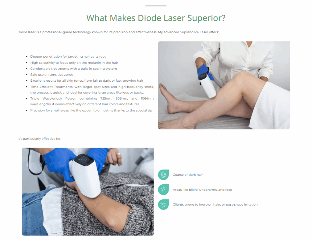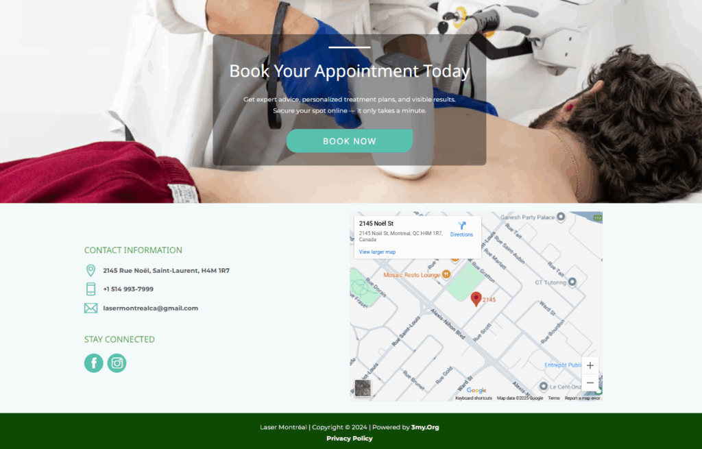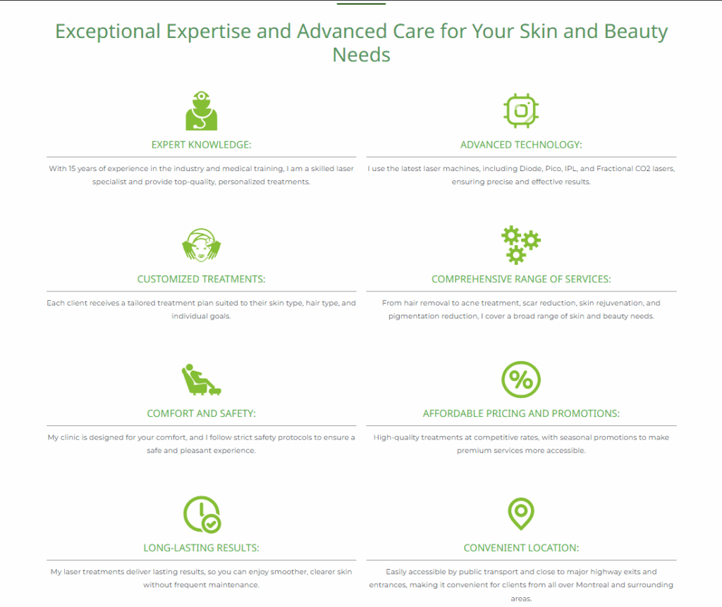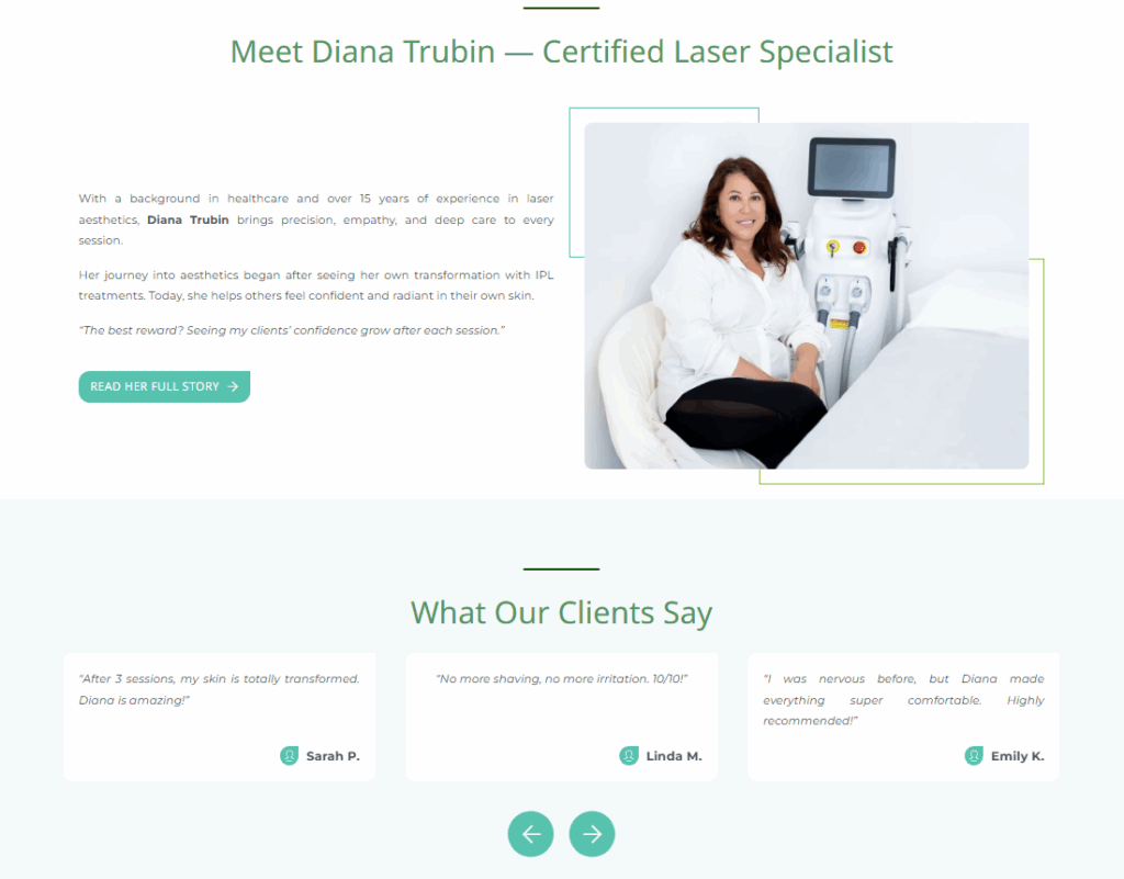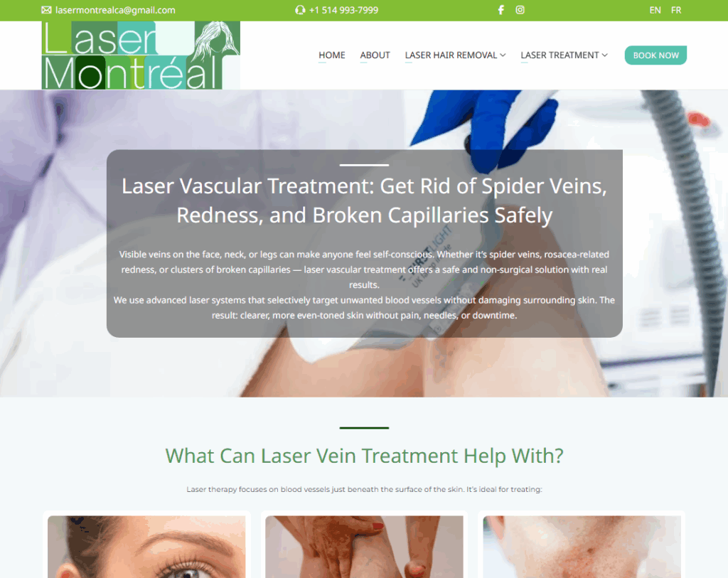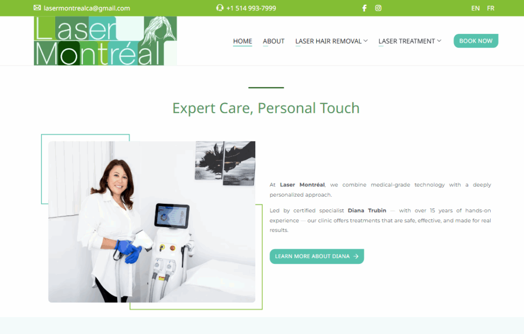 Un site web bilingue (EN/FR) pour une spécialiste certifiée en laser à Montréal. Conçu pour guider les visiteurs de l'intérêt initial à la réservation directe grâce à une structure claire axée sur la confiance. Comprend des descriptions de services détaillées (Pico, CO2, IPL, Diode), des témoignages de clients, une section « Rencontrez la spécialiste » et une feuille de route de traitement étape par étape. Entièrement réactif, optimisé pour le référencement, avec des images compressées et un temps de chargement rapide.