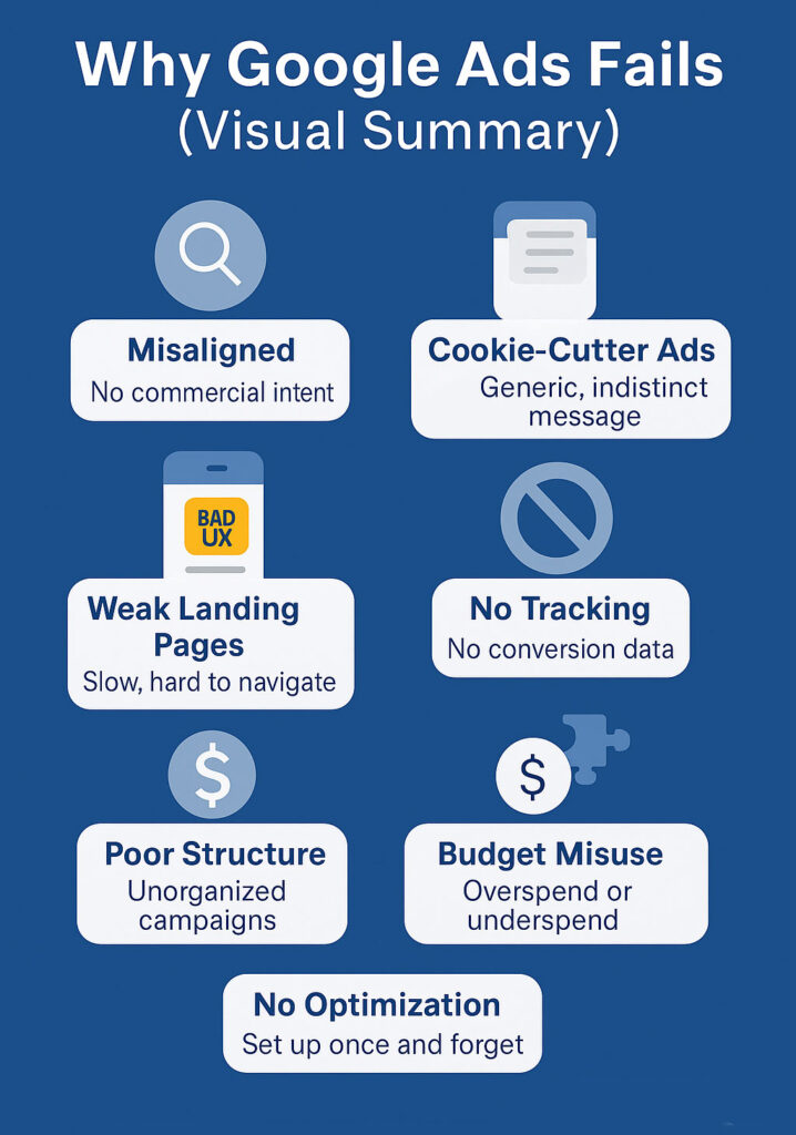 Misaligned keywords, vague ads, poor landing pages, and missing tracking all contribute to weak campaign performance. Use this visual summary to spot and fix what’s holding your results back.