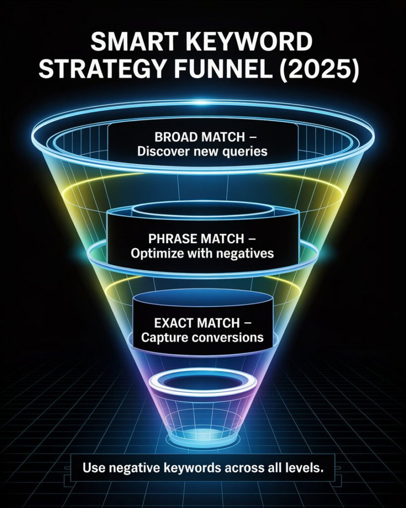 Figure: Visual comparison of Google Ads keyword match types — when to use exact, phrase, and broad match.