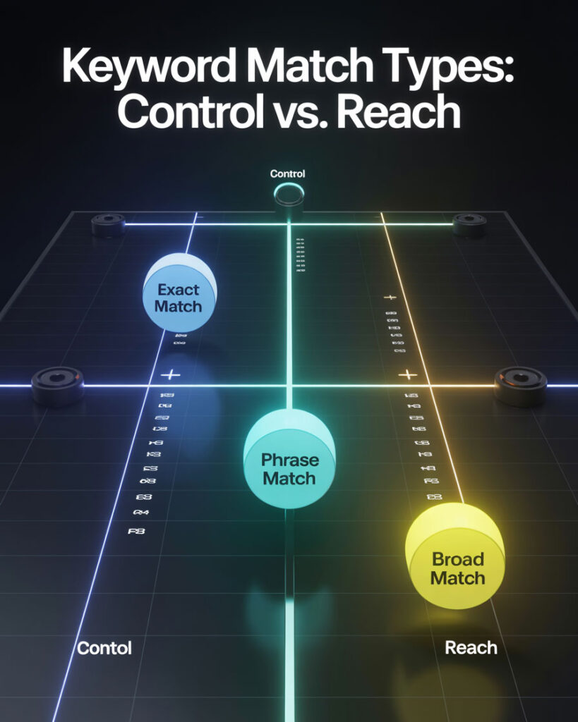 Keyword match types control how closely a user’s search query must align with your selected keyword in order for your ad to appear. Each type gives you a different level of control over reach, targeting precision, and cost.