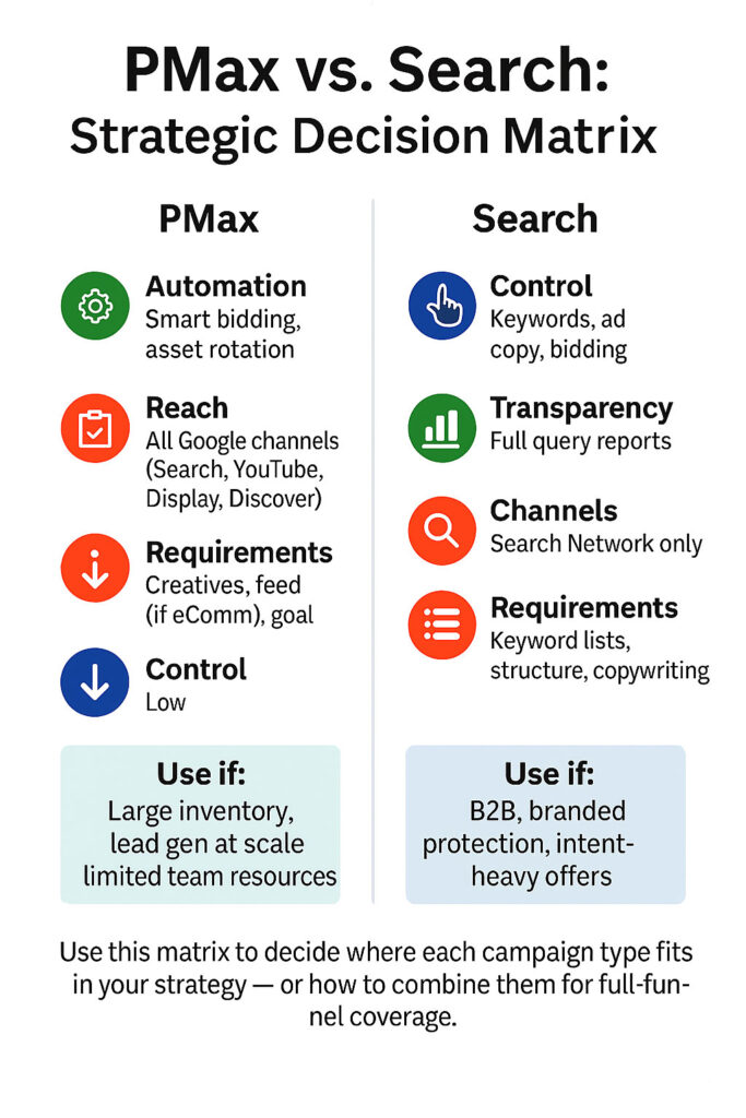 Performance Max is not a replacement for Search. It’s a distinct campaign type designed to find conversions across surfaces — not to respond to specific user queries. If you replace branded Search with PMax, expect higher CPAs and less clarity.