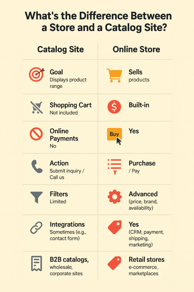 Not every website that showcases products is an online store. Some are catalogs. The distinction isn’t just technical — it shapes your user experience, operations, and sales model. If you’re building or optimizing a site, it’s essential to understand what sets these two formats apart.