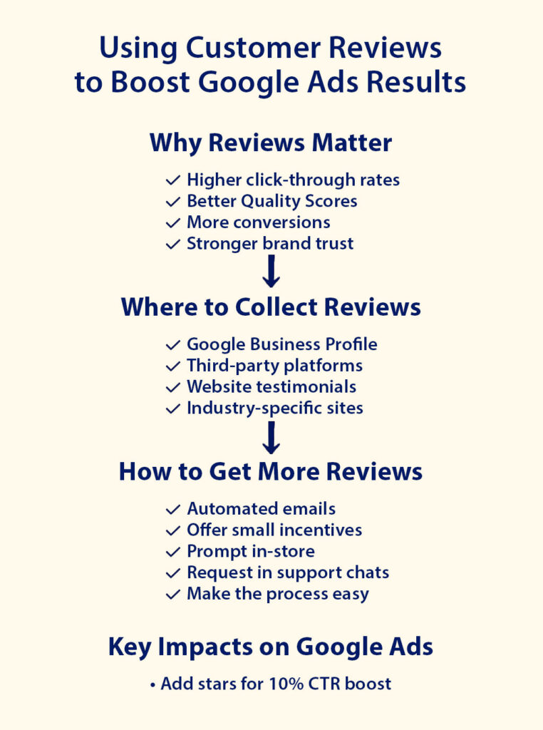 This visual shows how strategic use of reviews impacts ad extensions, Quality Score, and conversion rates. Use this map to connect your reputation data with measurable ad outcomes.